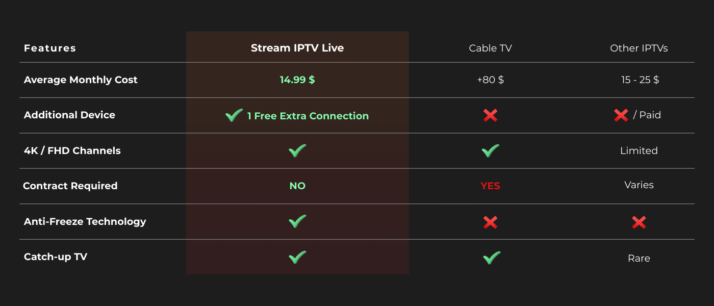 See how we stack up against typical cable and other IPTV providers.